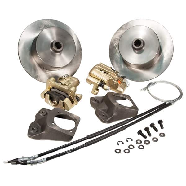 AC Industries Long Spline Axle Rear Disc Brake Kit, with e-Brake. Nodular iron bracket will not bend and keep proper alignment of caliper to the rotor. Fits ’73 and later vehicles with IRS.