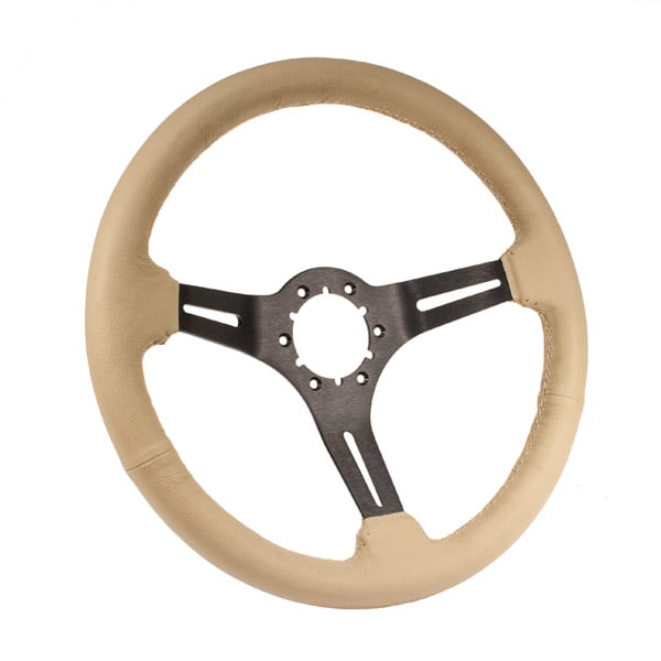 This high quality steering wheel features black 3-spoke design and a tan premium leather outer rim.
