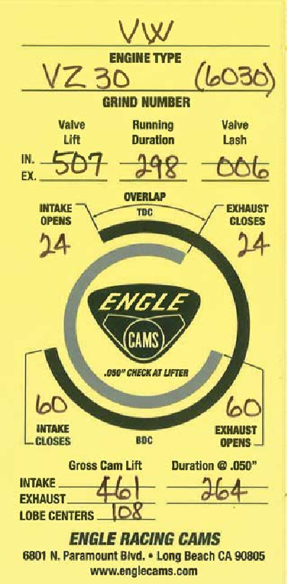 Engle VZ-30 Series Basic Camshaft Kit Includes: ? Engle VZ-30 Camshaft, part #6030? Engle High Performance Lifters, part #6001? Red Line Assembly LubeEngle Cams has taken the guesswork out of matching cams and the correct components for you! All of Engle cams components are of the highest quality available and packaged in an Engle Cams Master Box. For over 60 years Engle Cams have been made in the U.S.A. NOT China. Don?t take a chance with your motor!